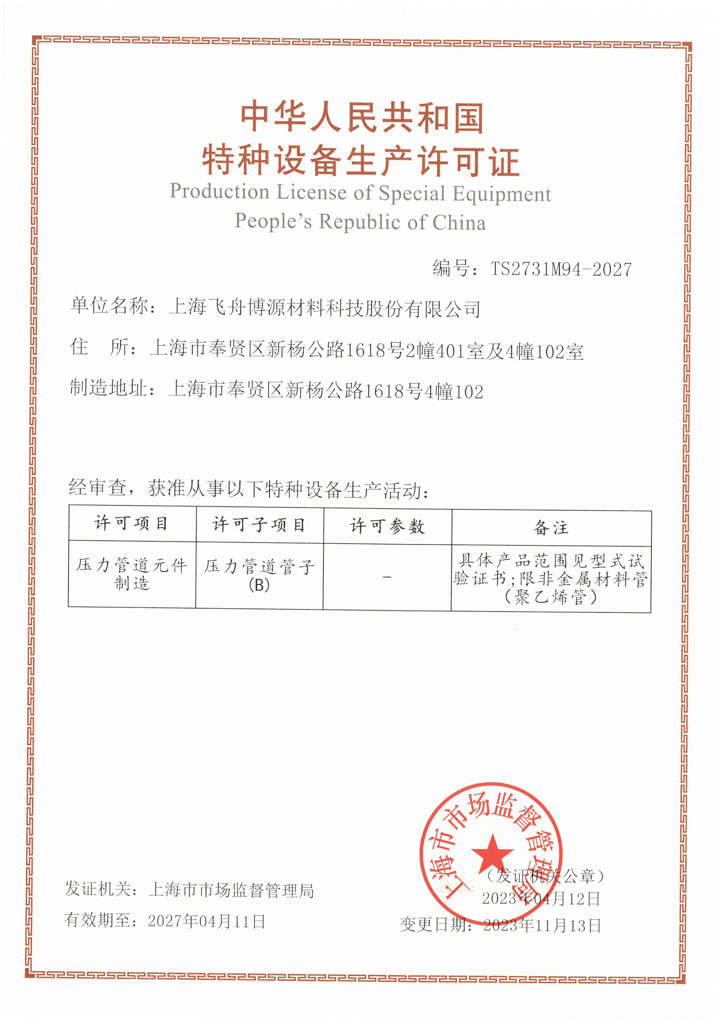 国家认定的特种设备生产许可证,证明公司具备管道产品生产资质。